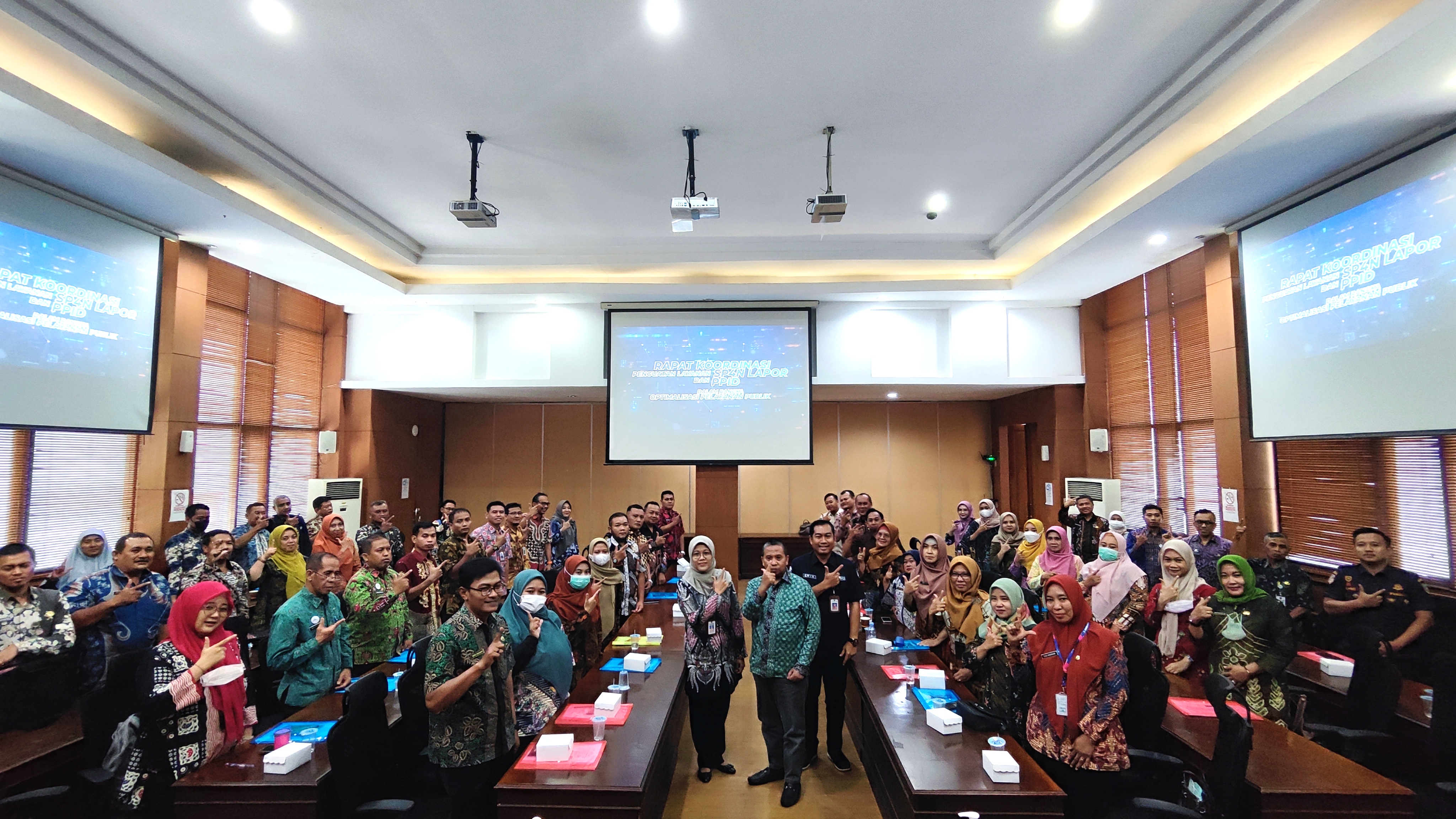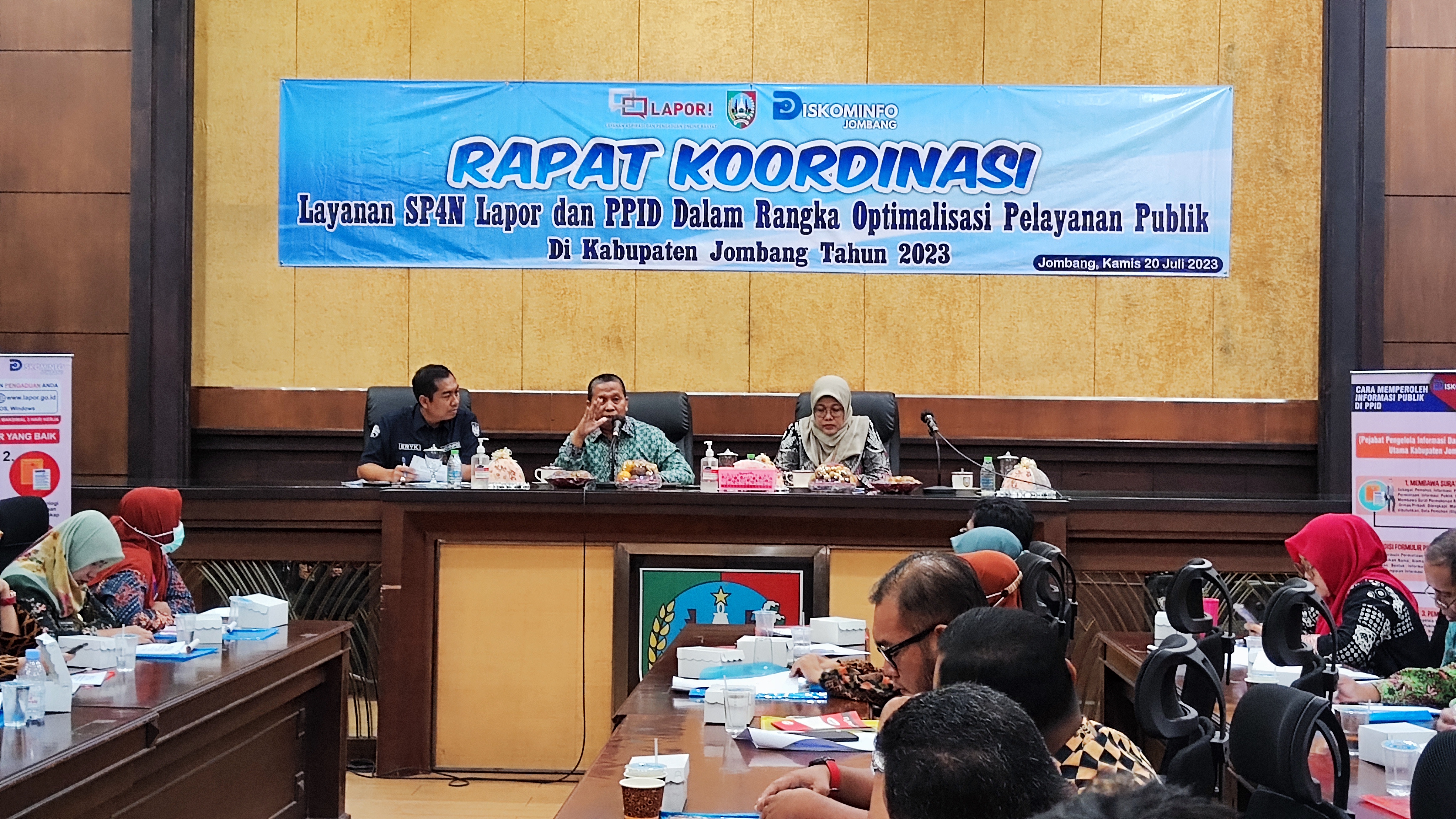 JOMBANGKAB - Bidang Humas Komunikasi Publik (HKP) Dinas Komunikasi dan Informatika (Kominfo) Kabupaten Jombang menggelar Rapat Koordinasi (Rakor) Penguatan Layanan SP4N Lapor dan PPID dalam rangka Optimalisasi Pelayanan Publik di lingkup Pemerintah Kabupaten (Pemkab ) Jombang pada Kamis (20/7/2023) di Ruang Suro Adiningrat Kantor Pemkab Jombang.